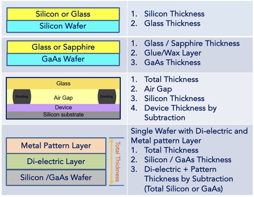 - Thickness Measurements of Bonded Wafers: Si-Glass, Si-Si, Si-Tape, Si-epoxy GaAs, InP, Sapphire, Quartz